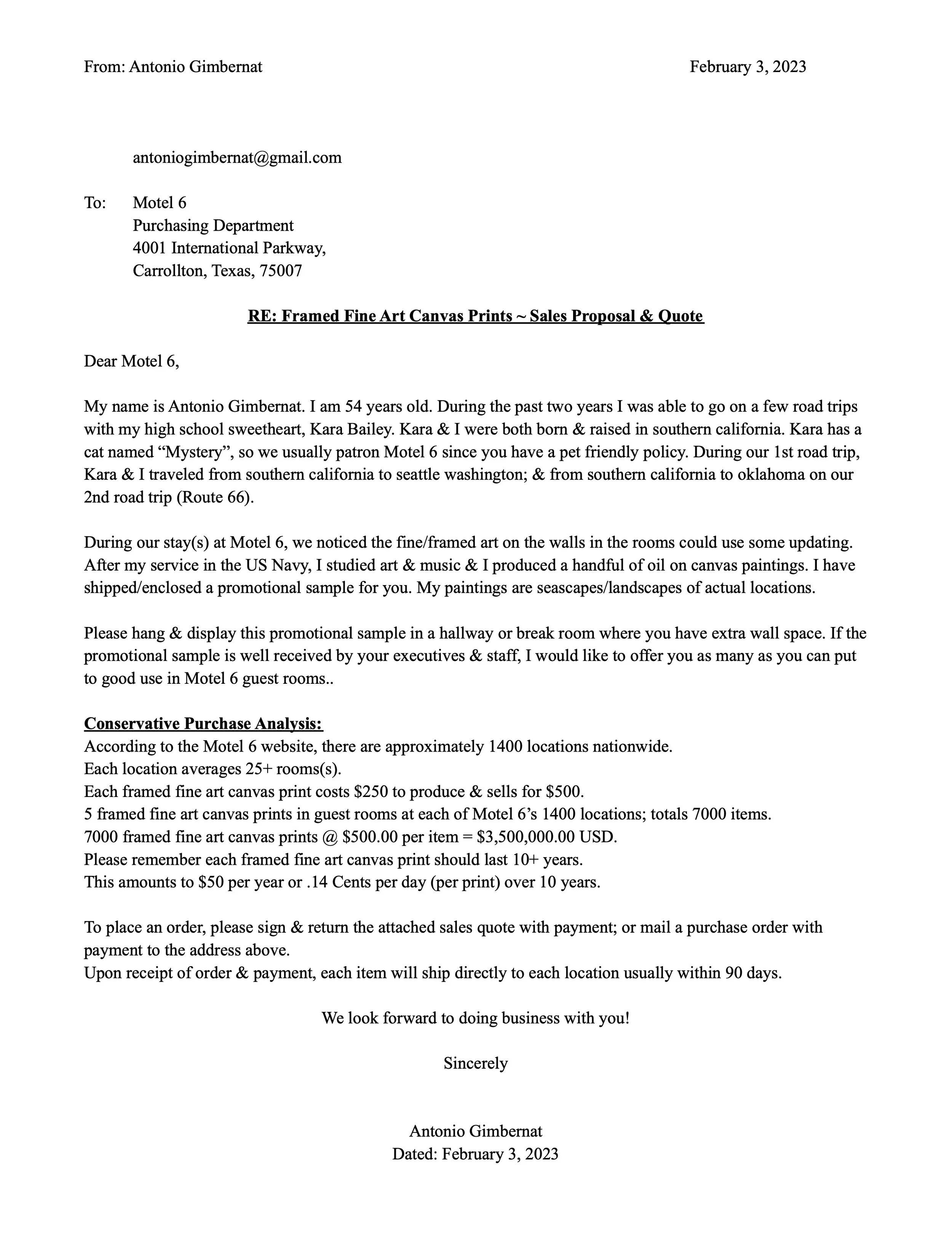 Most recently, Antonio has been exploring opportunities to market his fine art prints to motel chains.